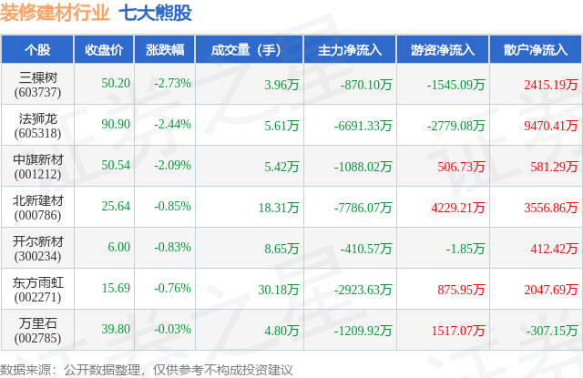个股表示方面,拆建筑材行业当日领跌股为三棵树(603737),该股当日报收50。2,下跌2。73%,成交量3。96万,从力资金净流出870。1万元。法狮龙(605318)以下跌2。44%紧随其后,该股当日成交量5。61万,从力资金净流出6691。33万元。除此之外,中旗新材(001212)、北新建材(000786)、开尔新材(300234)均进入当日熊股之列。具体个股列表见下表。